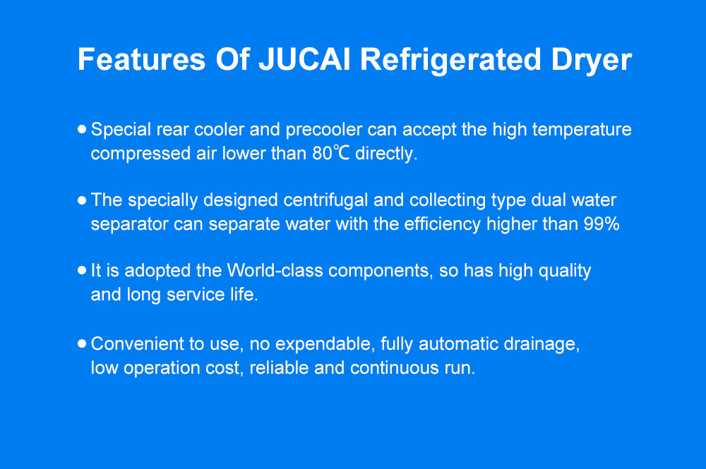 Brand:JUCAI Model:JS-15A Exhaust volume:2m3/min Compressed medium:Air Working principle:Air Dryer Performance:Low noise, power saving