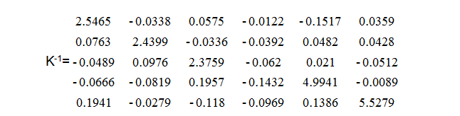 With this inverse matrix the loads that produced any set of simultaneous data from the sensor can be calculated. We start with the inverse matrix, K-1, and the equation: